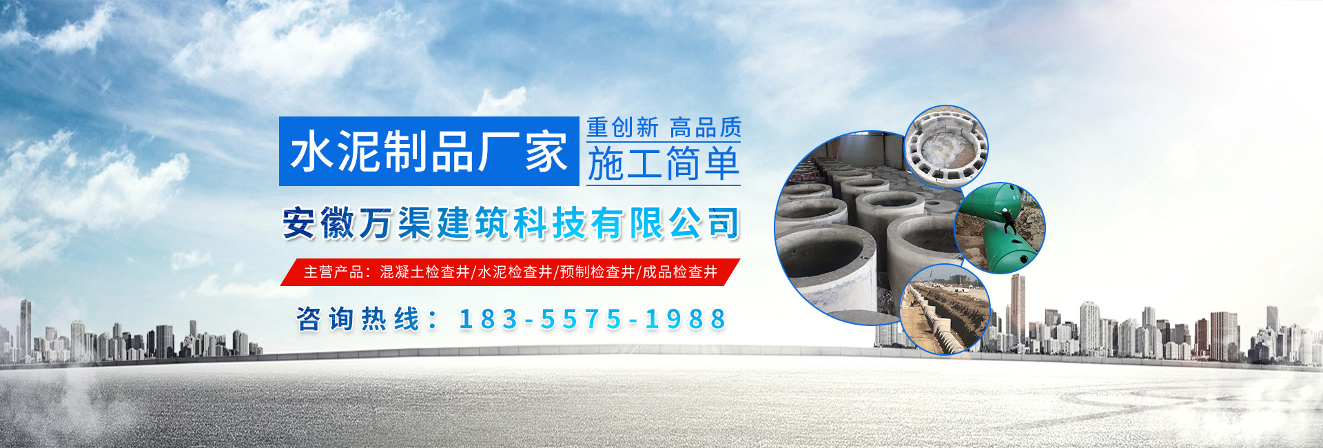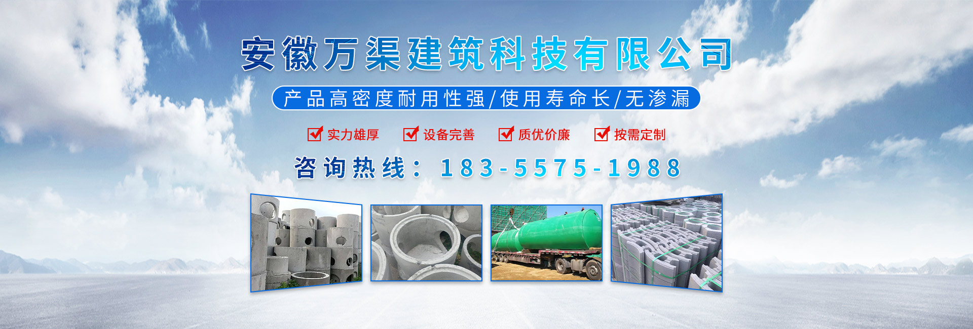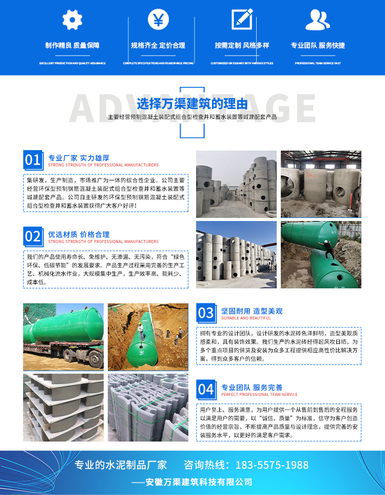 安徽萬渠建筑科技有限公司是集研發,生產制造,市場推廣為一體的綜合性企業。公司主要經營環保型預制鋼筋混凝土裝配式組合型檢查井和蓄水裝置等城建配套產品。產品生產過程采用獨特的生產工藝,機械化流水作業。產品大規模生產,生產效率高,耗能少,成本低,產品使用壽命長、免維護、無滲漏、無污染,符合“綠色環保,低碳節能”的發展要求,是傳統磚砌井池的理想替代產品。